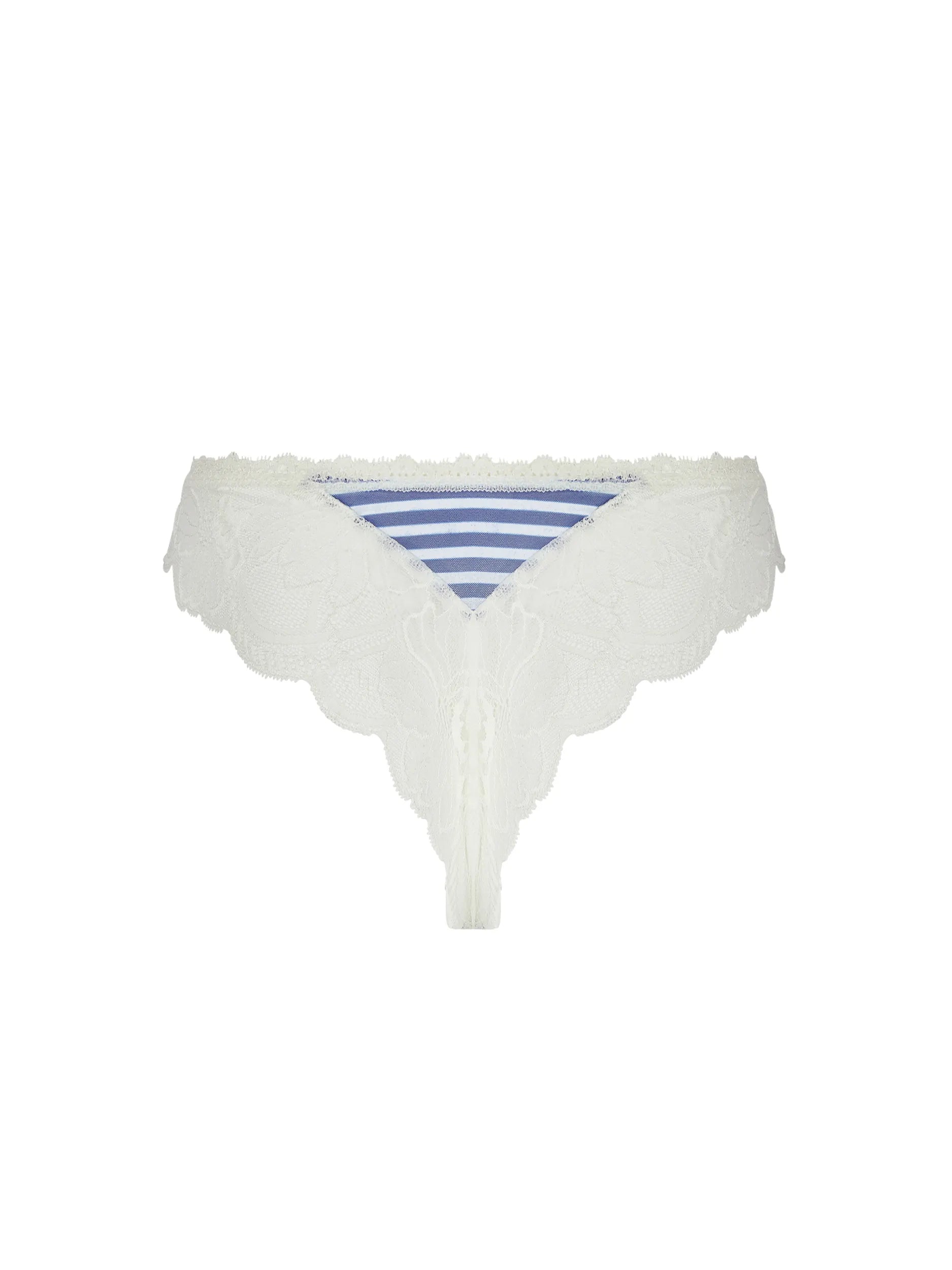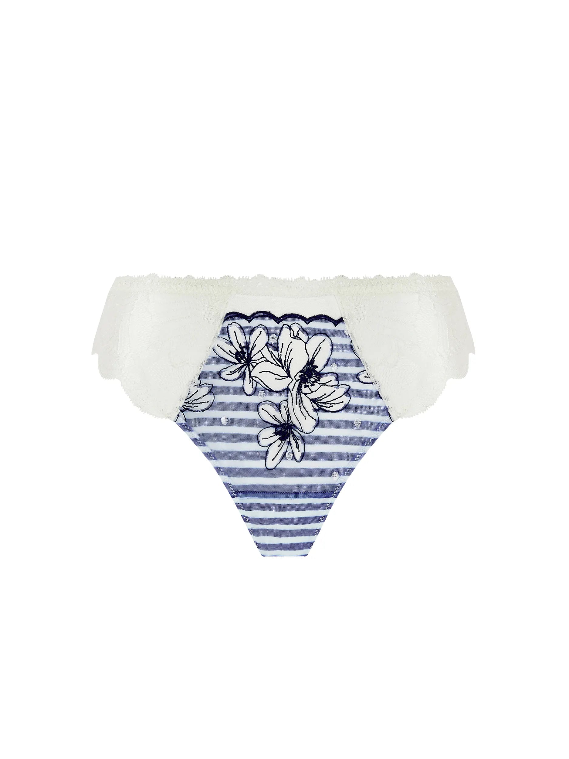 Exuding the essence of marine beauty, Cap Au Levant by Lise Charmel puts a fresh spin on a timeless wardrobe essential, blending the sophistication of sailor stripes with the ethereal touch of delicate floral embroidery and the allure of exquisite lace.